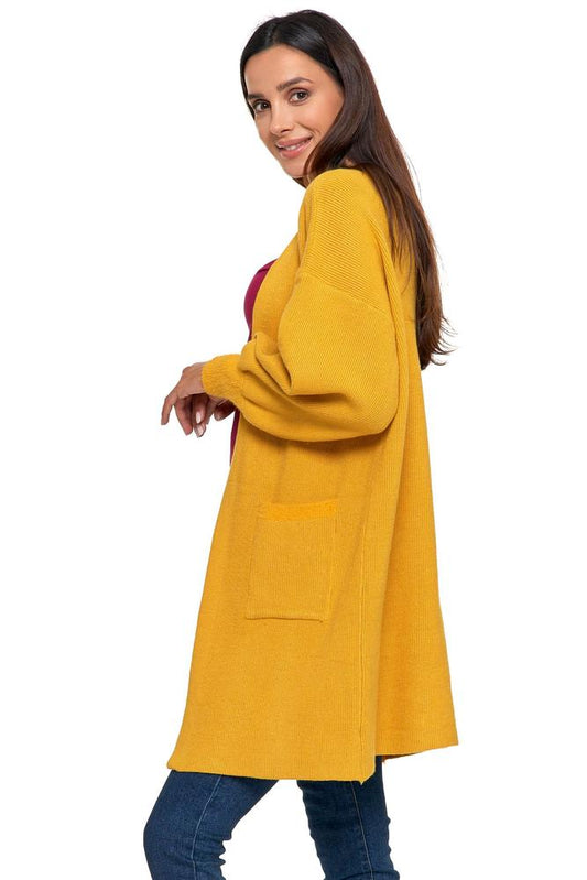 DAMSKI DŁUGI SWETER OTWARTY MUSZTARDOWY NU_S75