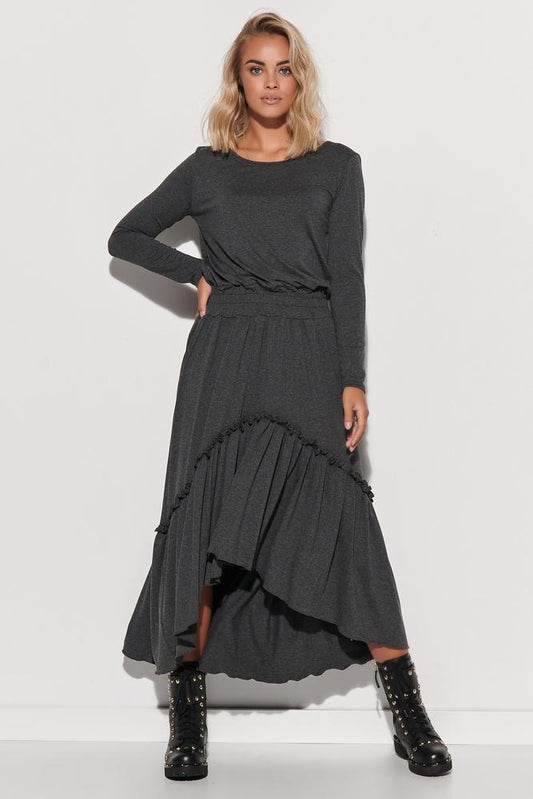 DZIANINOWA SUKIENKA MAXI Z GUMĄ I FALBANAMI CZARNA M573