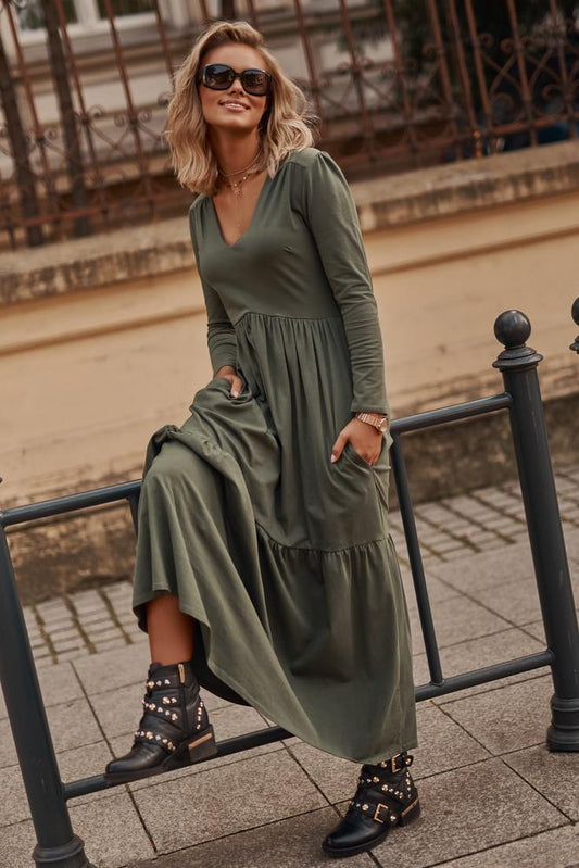 DŁUGA SUKIENKA Z KOPERTOWYM DEKOLTEM CZARNA M756