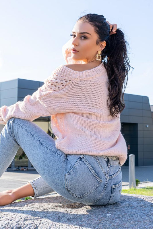 SWETER DAMSKI W SEREK Z WARKOCZAMI BABY PINK NU_S88