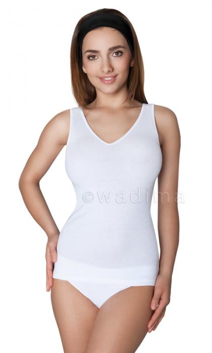 Idealnie dopasowuje się do ciała, nie krępując przy tym ruchów. Dekolt w serek, tak jak szerokie ramię bardzo ładnie wykończony bawełnianą lamówką z delikatnym, dekoracyjnym przeszyciem w kolorze podkoszulka, tzw. kroszetką. Brak bocznych szwów sprawia, że jest jeszcze bardziej komfortowy w użytkowaniu i niewidoczny pod wierzchnim ubraniem. Miękki, przyjemny dla ciała.