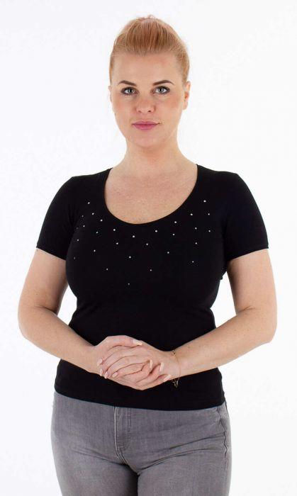 Prosty krój, dobra jakość i pomysłowy, dekoracyjny przód bluzki, ozdobiony różnej wielkości okrągłymi kryształkami.