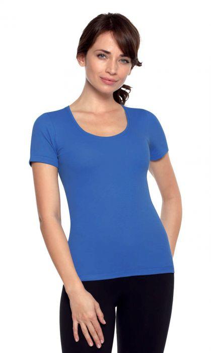 Okrągły dekolt wykończony wąską, bawełnianą wypustką w tym samym kolorze. Krótki rękaw zakończony podwinięciem. Brak szwów bocznych oraz splot ściągaczowy dzianiny zapewniają wysoki komfort użytkowania. Doskonała na lato, choć sprawdzi się również jako baza pod bluzę czy sweter, a w chłodniejsze dni jako wygodny i miły dla ciała damski podkoszulek.