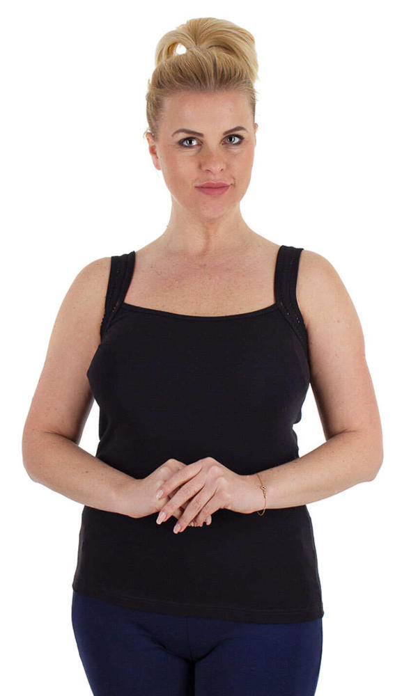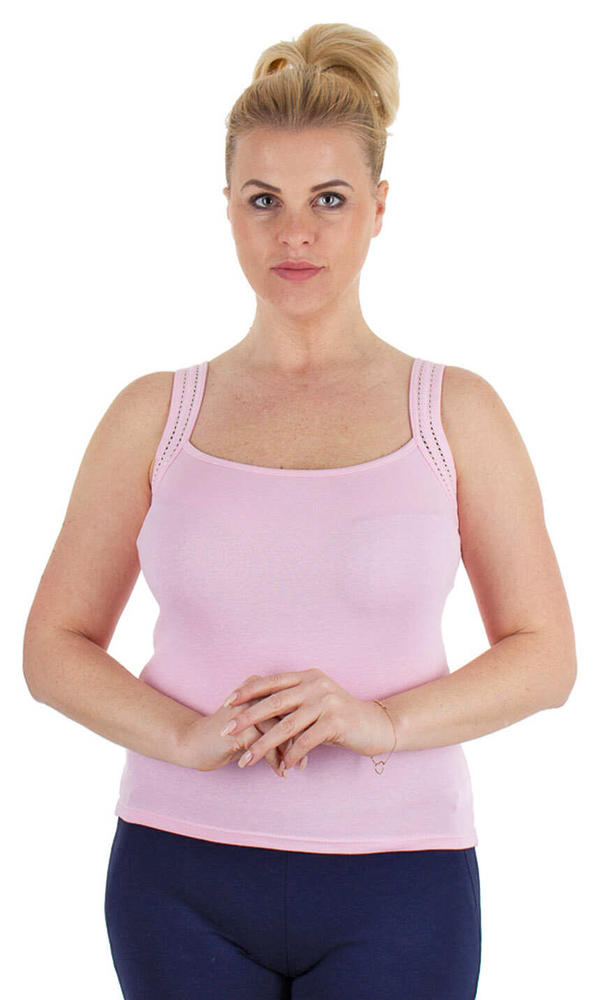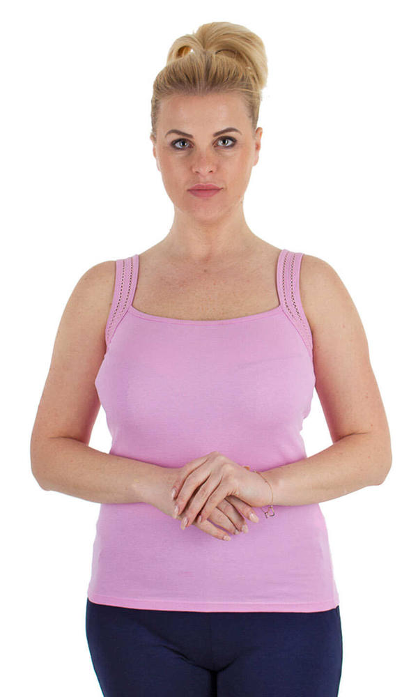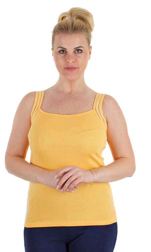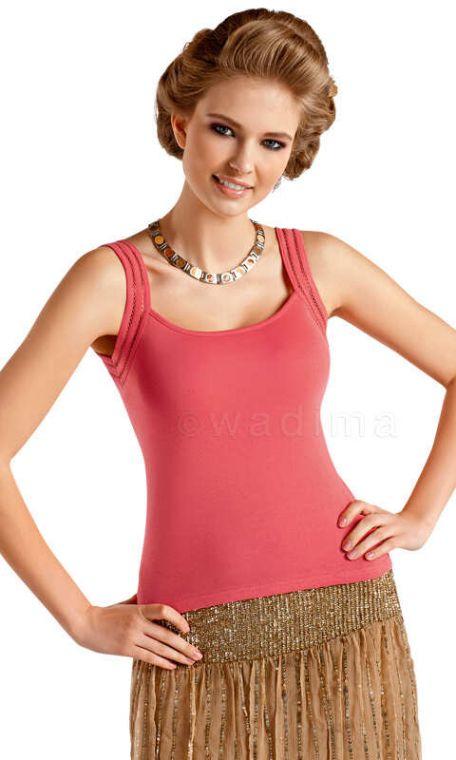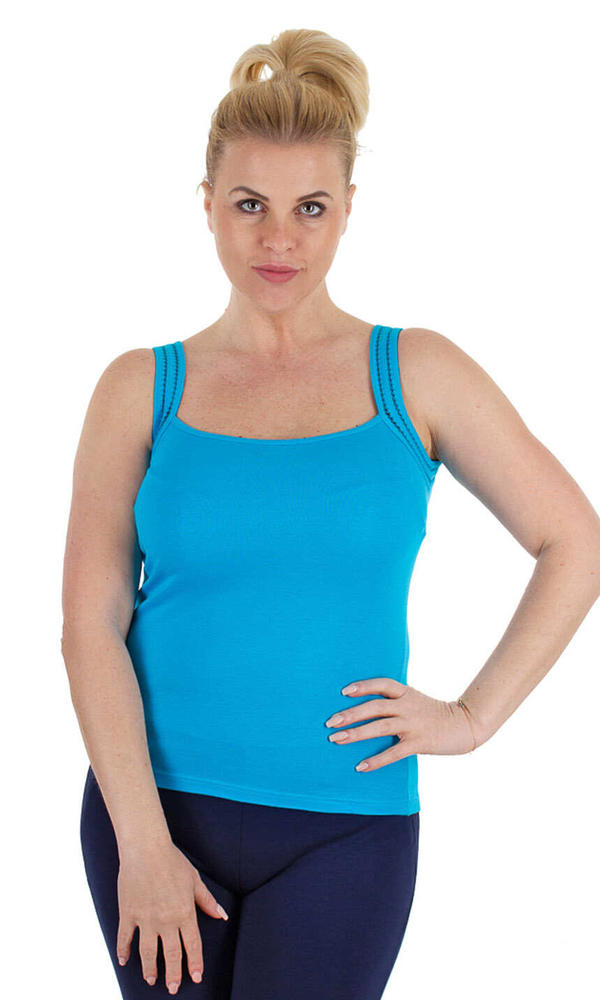 Wąskie ramiączka ozdobione dekoracyjnym ściegiem. Dobry gatunek materiału uzyskany z połączenia bawełny i elastanu zapewnia elastyczność i trwałość. Rewelacyjna na upalne dni. Uwaga! Krótka w stanie, długość lekko poniżej pasa.