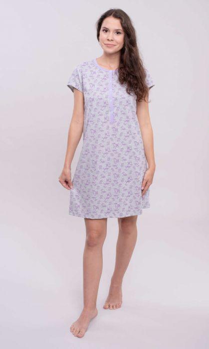 Półokrągły dekolt wykończony jasnofioletową lamówką. Pośrodku materiałowe listwy z zapięciem na pięć jasnofioletowych nap. Krótki rękaw w formie szerokiego, opadającego ramienia, tak jak i dół koszuli wykończony podwinięciem. Przyjemna dla ciała i bardzo praktyczna. Idealna dla miłośniczek czworonożnych przyjaciół.