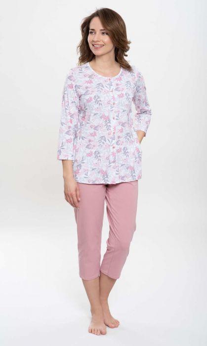 Bluza biała, z nadrukiem w kwiaty w efektownie zestawionych, jasnych kolorach. Półokrągły dekolt wykończony wąską lamówką z tego samego materiału. Bluza zapinana na siedem ładnie dobranych kolorystycznie, jasnoróżówych guziczków, rękaw wszyty klasycznie, zakończony podwinięciem. Spodnie w kolorze mistycznego różu, z wciągniętą w pasie i zaszytą gumką.