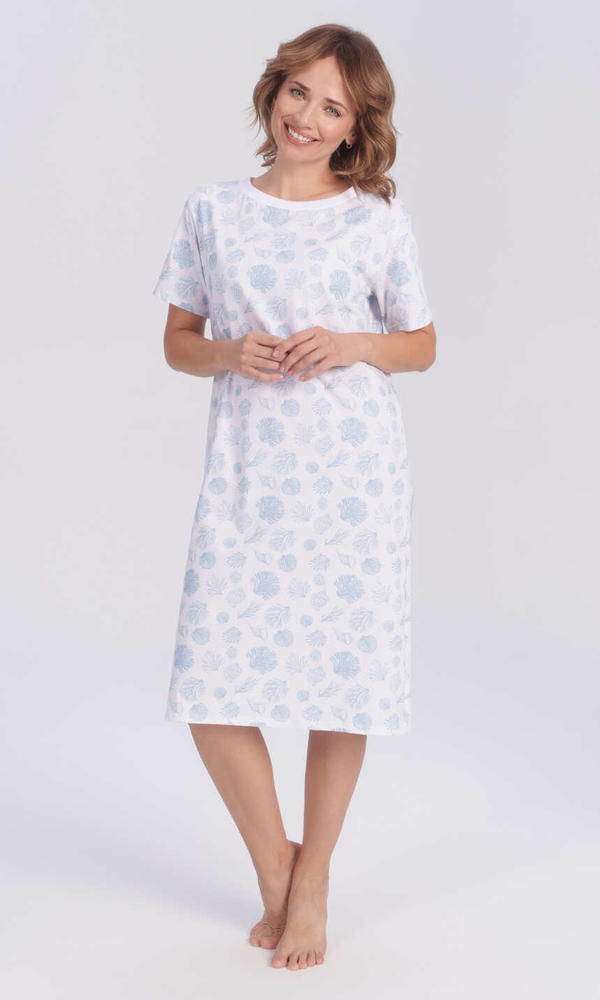 Forma koszuli prosta. Półokrągły, szeroki dekolt wykończony białą, bawełnianą, ściągaczową wypustką. Rękaw z tzw. lekko opuszczonym ramieniem, zakończony podwinięciem. Dół koszuli z piętnastocentymetrowymi rozporkami po bokach. Bardzo estetyczna, wygodna i miła dla ciała.