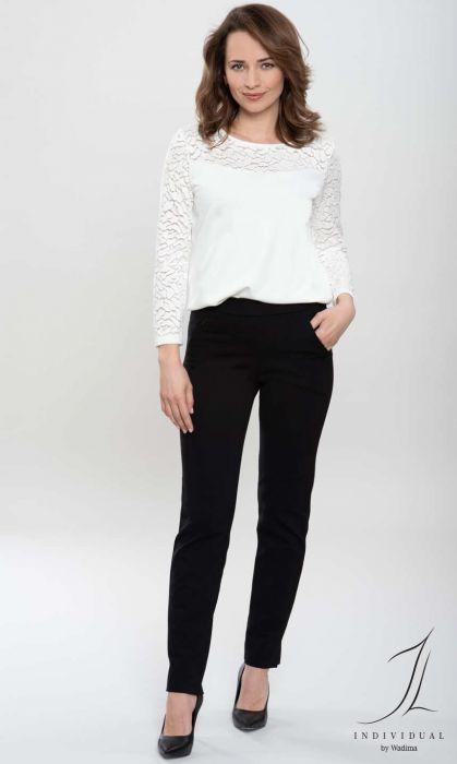 Wykonane z połączenia naturalnej wiskozy, poliamidu - by zachowywały zawsze swój fason i nie ulegały wypychaniu się kolan oraz niewielkiej ilości nadającego dzianinie sprężystości elastanu. Wysokie w stanie, dzięki czemu ładnie modelują sylwetkę. W pasie wciągnięta i zaszyta pięciocentymetrowa guma. Z obu stron kieszenie z tzw. krytymi suwakami. Nogawki gładkie, lekko zwężane ku dołowi, z niewielkim rozporkiem z boku, bardzo ładnie wykończone tzw. bezszwową techniką.