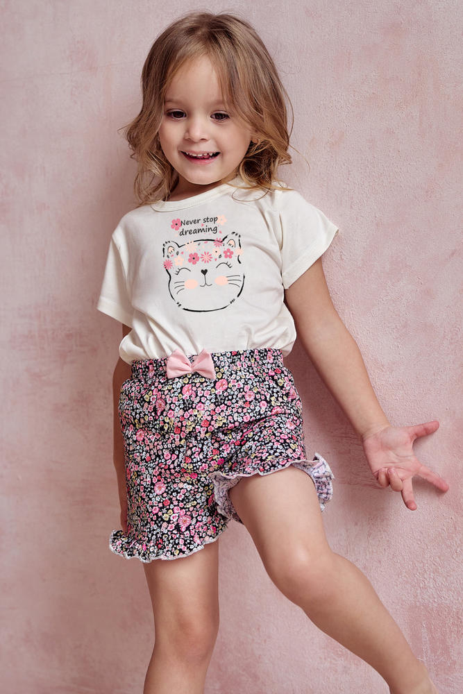 Piżama dziewczęca bawełniana, koszulka z krótkim rekawem ozdobiona nadrukiem. Do kompletu krótkie wzorzyste spodenki.