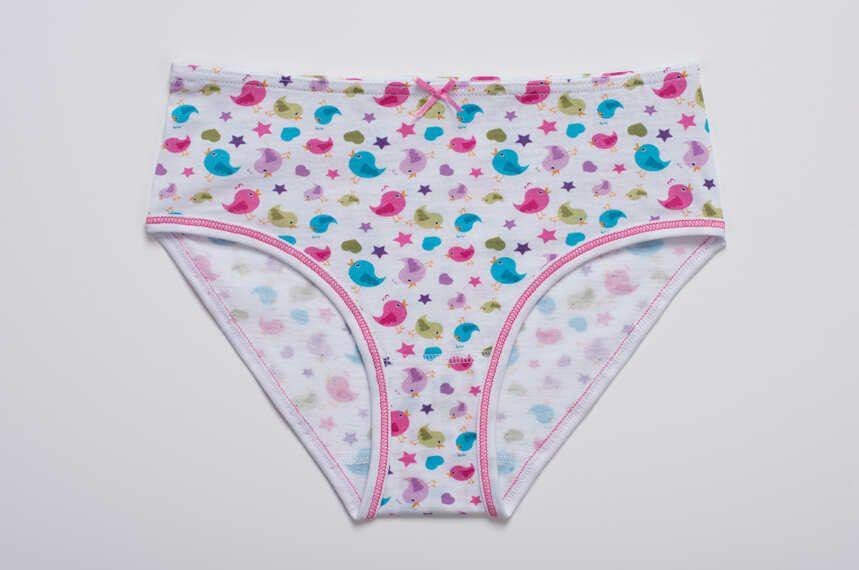 Forma klasyczna, wygodna, głęboka. W pasie wciągnięta i zaszyta gumeczka. Pośrodku mała, satynowa kokardka. Nogawki, by nie ocierały ciałka, wykończone białą lamówką i przeszyte dekoracyjnym, różowym ściegiem.