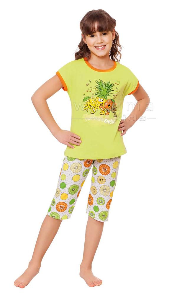 Dekolt półokrągły, tak jak rękawki wykończony pomarańczowym ściągaczem. Rękawki w formie szerokiego, opadającego ramienia, bez żadnych szwów. Na przodzie bardzo zabawny, kolorowy nadruk przedstawiający roześmiane, śpiewające cytrusy, a pod nim napis owocnych snów. Spodenki do kolanka , całe z dużymi cytrusowymi plastrami, z zaszytą w pasie gumką. Całość bardzo efektowna, zabawna, idealna na lato.