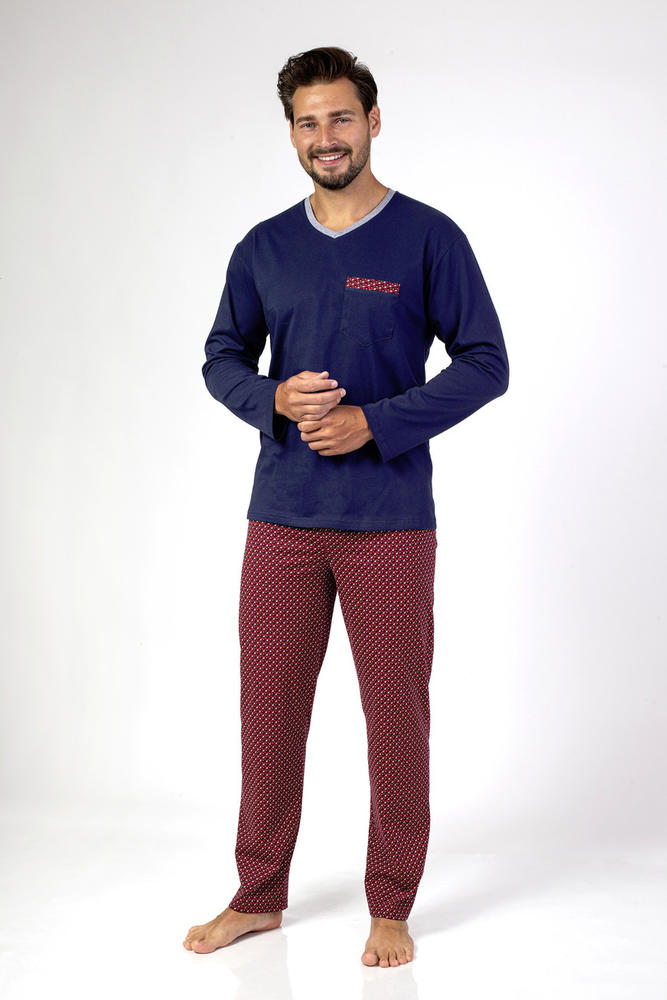 Klasyczna piżama męska z długim rękawem z wysokogatunkowej bawełny. Koszulka gładka z dekoltem w serek i kieszonka na wysokości klatki piersiowej. Do kompletu wzorzyste spodnie z długimi nogawkami.