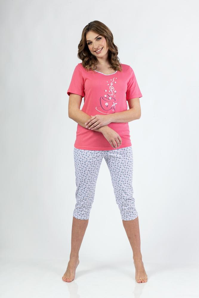 Piżama Damska 685 wykonana z miłej w dotyku bawełny koszulka z krótkim rękawem okrągły dekolt z lamówką w kolorze spodni z przodu ozdobny print do kompletu wzorowane spodnie nogawki o długości 3/4 w pasie gumka obszyta bawełną .