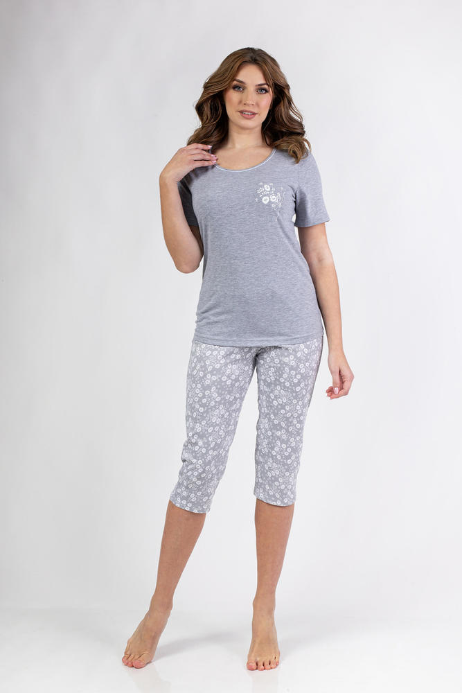 Piżama damska z krótkim rękawem, uszyta z miękkiej bawełny, Dekolt okrągły, obszyty kontrastującą lamówka, przód ozdobiony delikatnym nadrukiem. Do kompletu wzorzyste spodnie długości 3/4.