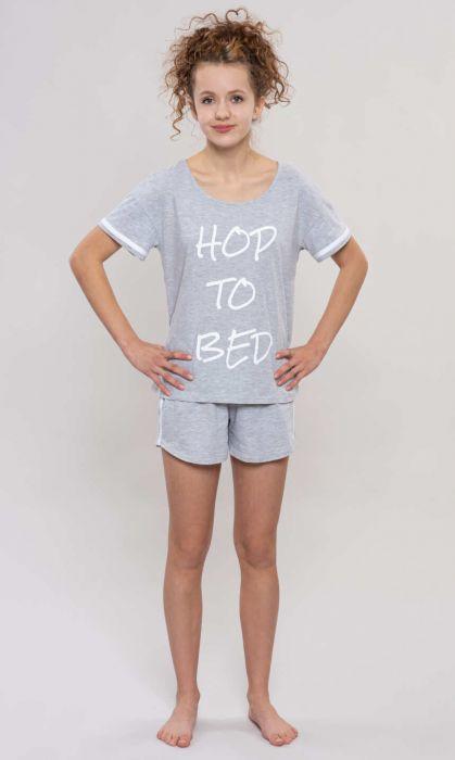 W jasnym, miłym dla oka kolorze szarego melanżu z białymi akcentami. Bardzo dobrej jakości; miękka, przyjemna dla ciała. Półokrągły dekolt porządnie wykończony wywiniętą pod spód lamówką. Krótki rękaw z białą lamówką. Przód bluzy z ogromnym, białym nadrukiem. Spodenki z wciągniętą i zaszytą w pasie trzy centymetrową gumą.