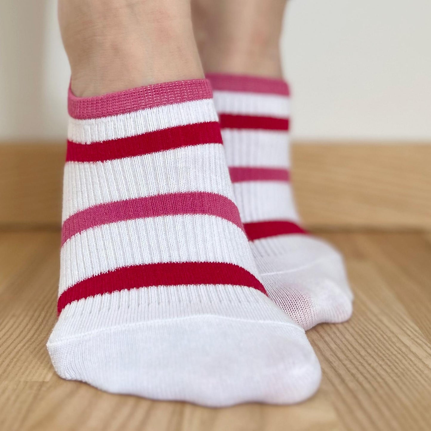 Skarpetki charakteryzują się kolorowym, prążkowanym wzorem w paski oraz jednolitymi kolorami z kontrastującymi detalami, co nadaje im wyrazistego charakteru. Warianty kolorystyczne to dynamiczne połączenia, które wprowadzą świeżość i energię do każdej stylizacji. Silikonowe wykończenie na pięcie zapobiega przesuwaniu się skarpetek, zapewniając komfort i pewność noszenia.