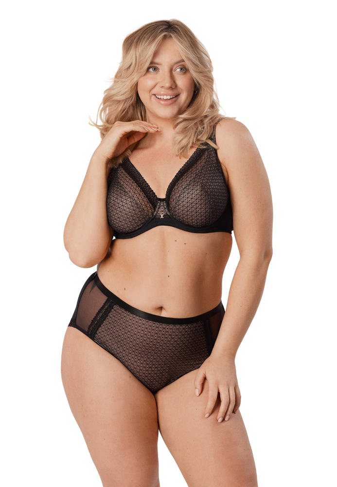 Ten czarno-beżowy biustonosz miękki z nowej kolekcji jesiennej doskonale łączy funkcjonalność z subtelną elegancją, oferując wygodne wsparcie dla większych rozmiarów. Beżowa baza miseczek, pokryta czarną koronką o geometrycznym wzorze, tworzy intrygujący kontrast, podkreślając zmysłowy styl bielizny.Miękka konstrukcja braletki została starannie przemyślana, aby zapewnić komfort i stabilność. Miseczki doskonale dopasowują się do naturalnych kształtów, delikatnie podtrzymując biust bez dodatkowego usztywnienia. Szerokie, regulowane ramiączka i solidne zapięcie na plecach zapewniają idealne dopasowanie, a subtelne ozdobne detale nadają całości wyjątkowego charakteru.