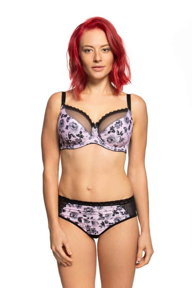 Półusztywniany biustonosz Daniela o konstrukcji SS10. Miseczka dolna, środek oraz boczki z pięknej dzianiny drukowanej o wzorze kwiatów dzikiej róży. Miseczka górna to stabilny tiul w kolorze czarnym podszyty tiulem w kolorze jasnego różu. Górna miseczka obszyta jest ozdobną taśmą. Plecy odcinane z elastycznego czarnego tiulu podszytego tiulem różowym, fiszbiny boczne. Konstrukcja z podwyższonym środkiem który idealnie przylega do mostka oraz z pogłębionymi miseczkami. Dwie czarne kokardki na styku ramiączek i misek i jedna ozdobna kokardka z kamieniem na środku biustonosza. Skład: 52% Poliamid, 25% Poliester, 16% Bawełna, 4% Poliuretan, 3% Elastan.
