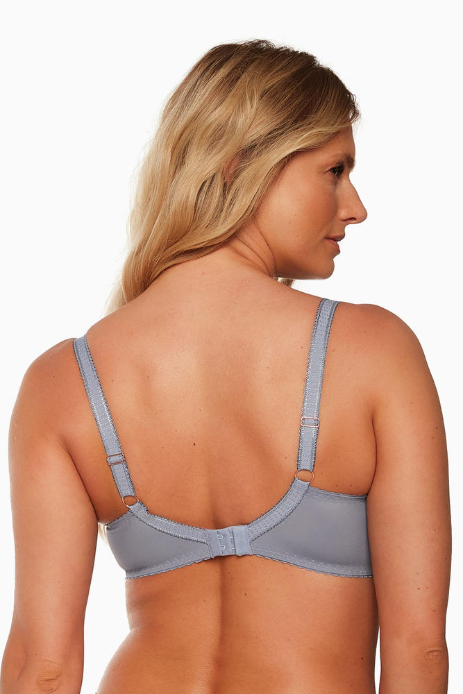 Półusztywniany biustonosz Helenia. Piękny niebieski biustonosz z miseczką wyciągniętą do ramiączka, o niesamowitej stylistyce. Górna część miseczki z jasnego tiulu. Dolna miseczka z koronki elastycznej, podszytej cienką pianką gorseciarską. Plecy całe, z grubej gładkiej mikrofibry. Krój średnio zabudowany, podwyższony krój dolnej miski zakrywa sutek. Pionowe cięcie na dolnej misce sprawia, że biustonosz dobrze przylega do piersi. Środek biustonosza średniej wysokości, dokładnie przylega do mostka. Świetnie nadaje się pod bluzkę z większym dekoltem. W modelu zastosowano fiszbiny okalające biust, obwód modelu bez fiszbin bocznych. Model mocno zbiera piersi i nadaje im okrągły kształt.
