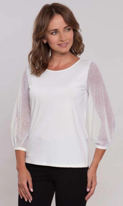 Kobieca, elegancka, z koronkowymi, delikatnymi rękawami bluzka.Wykonana z połączenia naturalnej wiskozy i niewielkiej ilości nadającego dzianinie sprężystości elastanu.Klasyczny fason. Półokrągły dekolt wykończony lamówką z tego samego materiału. Rękaw wszyty klasycznie, z marszczeniem na końcu i elegancką, wąziutką lamówką w tym samym kolorze. Dół zakończony podwinięciem. Idealna do eleganckiej spódniczki bądź spodni.