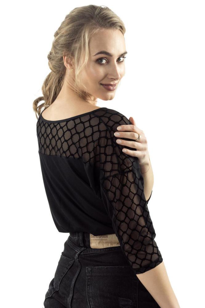 Bluzka o luźniejszym, nietoperzowym kroju z rękawami 3/4. Na dekolcie i rękawach wstawki z ozdobnego tiulu z geometrycznym wzorem.