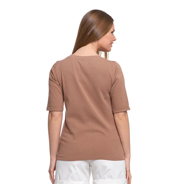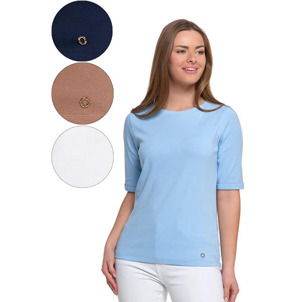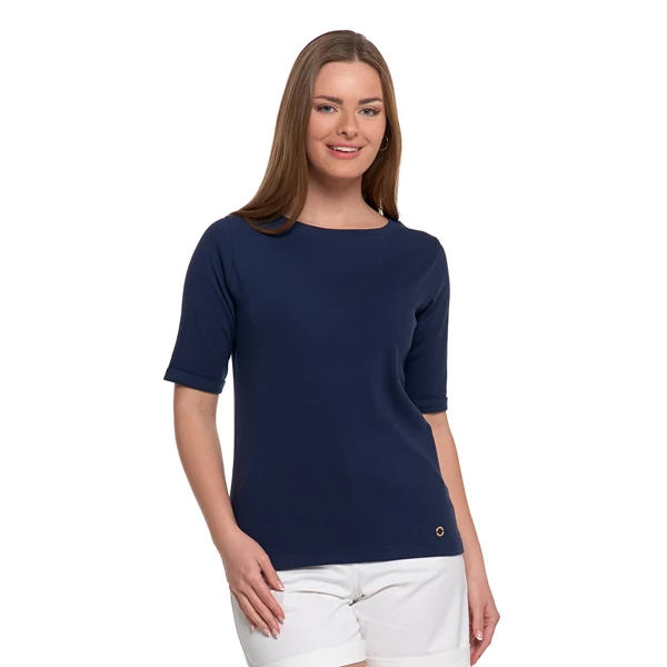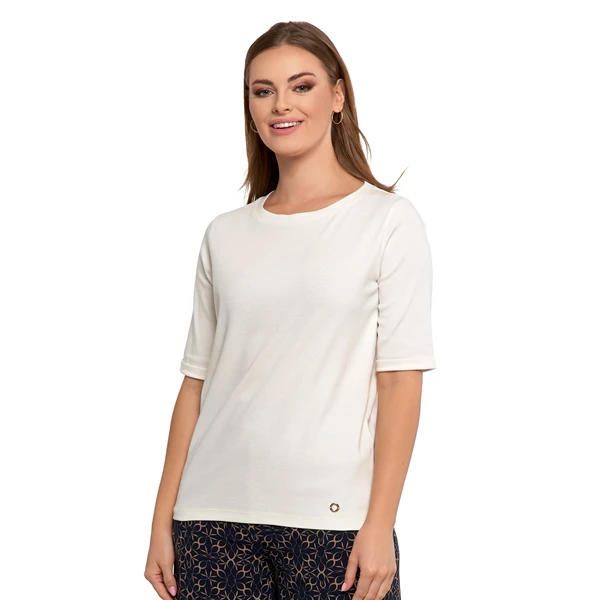 Ta klasyczna bluzka damska to doskonałe połączenie komfortu i uniwersalnego stylu. Wykonana z wysokiej jakości bawełny z dodatkiem elastanu, zapewnia przyjemne dopasowanie do sylwetki i swobodę ruchów przez cały dzień. Prosty fason z półokrągłym dekoltem podkreśla subtelną elegancję, a rękawy o długości do łokcia nadają bluzce nowoczesny charakter. Dostępna w klasycznych, stonowanych kolorach, które doskonale komponują się z codziennymi i bardziej formalnymi stylizacjami.