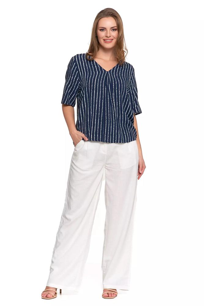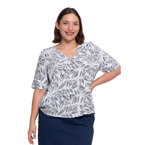 Lekka, zwiewna i niezwykle kobieca bluzka, która łączy komfort z elegancją, jest przyjemna w dotyku i przewiewna, co sprawia, że doskonale sprawdzi się zarówno na co dzień, jak i na bardziej eleganckie okazje. Subtelny dekolt w kształcie litery V pięknie podkreśla szyję, a luźny fason zapewnia swobodę ruchów i wygodę noszenia. Krótkie rękawy dodają lekkości, a wzorzysty materiał nadaje całości wyjątkowego charakteru.