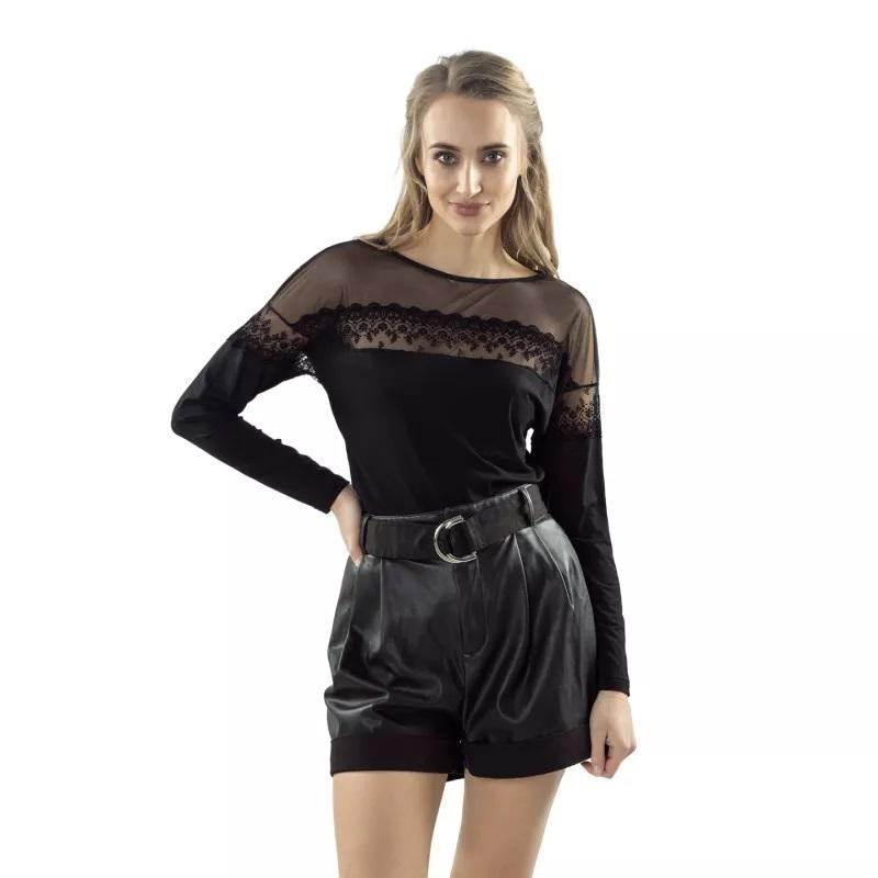 Bluzka o nietoperzowym kroju z obniżoną linią ramion. Góra bluzki wykonana z tiulu, który na plecach tworzy dekolt kopertowy. Nad biustem i na rękawach wstawka z szerokiej koronki.