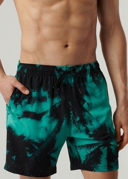 Szorty kąpielowe o długości nogawek, sięgającej połowy uda i średniej wysokości talii, wiązane są w pasie na sznurek, po bokach mają kieszenie, a na lewej nogawce logo Atlantic. Materiał szybkoschnący.