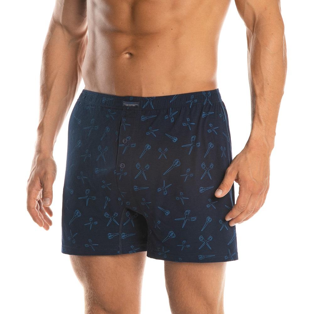 Luźne bokserki męskie M-897BX z firmy Lama granatowe w nożyce. Wykonane z naturalnej tkaniny 100% bawełny. W pasie wykończone tradycyjnie gumą w tunelu. Klasyczny krój i luźny fason zapewnia doskonały komfort użytkowania i całkowitą swobodę ruchów. Opakowanie zawiera jedną sztukę produktu.