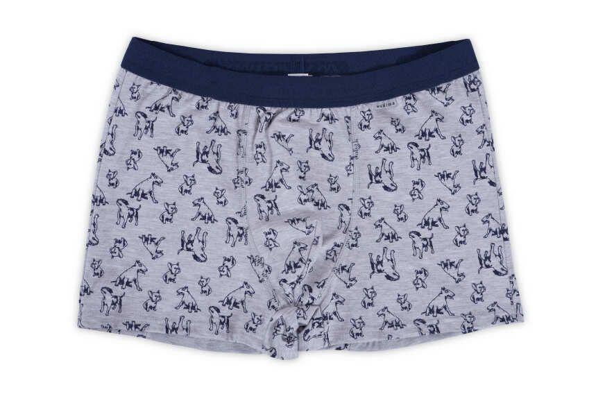 Bokserki w kolorze szarego melanżu z granatowym nadrukiem w pieski. W pasie wszyta szeroka, granatowa guma. Nogawki zakończone podwinięciem. Wykonane z miękkiej bawełny z niewielkim dodatkiem elastanu.