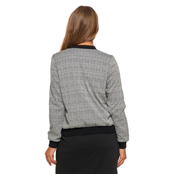 Damską bluzę typu bomberka, która łączy w sobie klasyczny wzór z nowoczesnym designem. Wykonana z wysokiej jakości materiału, bluza posiada charakterystyczny wzór w kratkę, który nadaje jej eleganckiego i ponadczasowego charakteru. Bluza zapinana jest na zamek, co pozwala na wygodne noszenie i dopasowanie do różnych stylizacji. Dodatkowo, bomberka wyposażona jest w praktyczne kieszenie, które są zarówno funkcjonalne, jak i estetyczne, idealne do przechowywania drobnych przedmiotów. Ta uniwersalna bluza sprawdzi się zarówno w codziennych, jak i bardziej eleganckich stylizacjach, dodając każdej z nich odrobinę klasy i szyku.