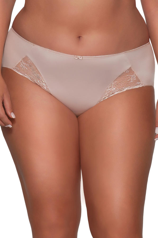 Figi brazyliany, przód ozdobiony koronką, tył gładki.
