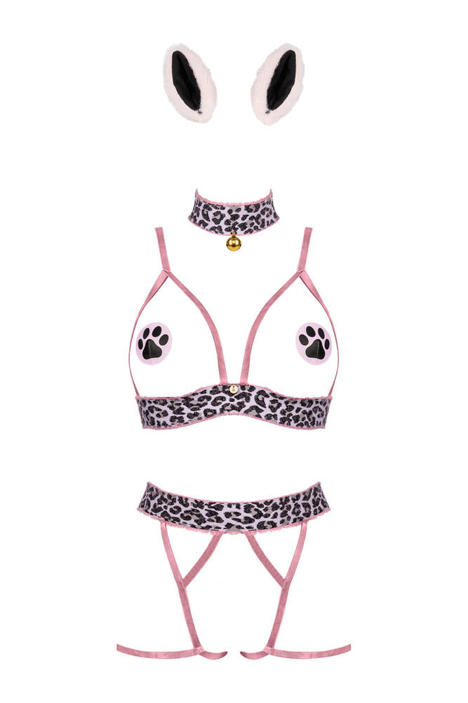 Odważny kostium składający się z topu, stringów oraz dodatkowych elementów jak uszka, osłonki i opaski na szyję.