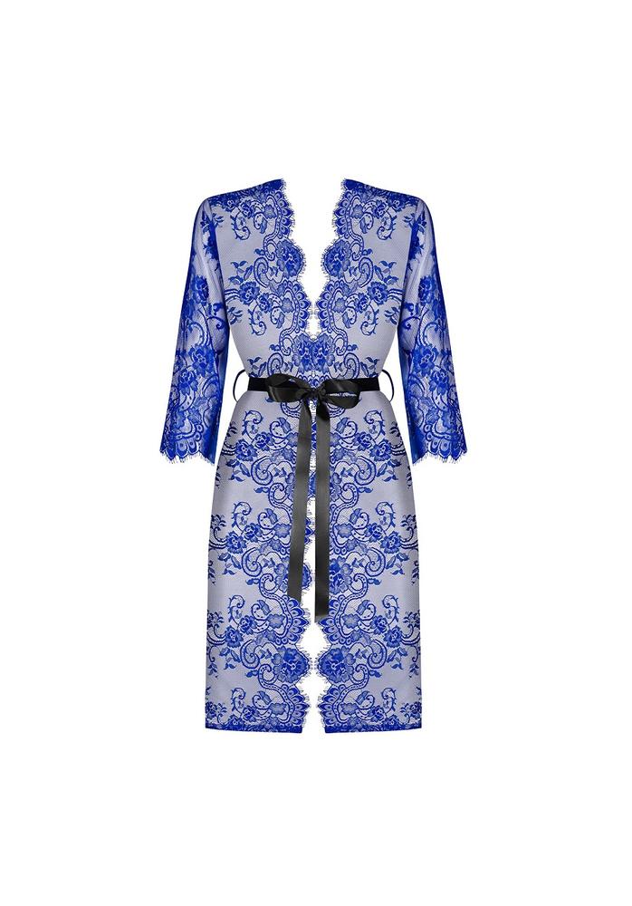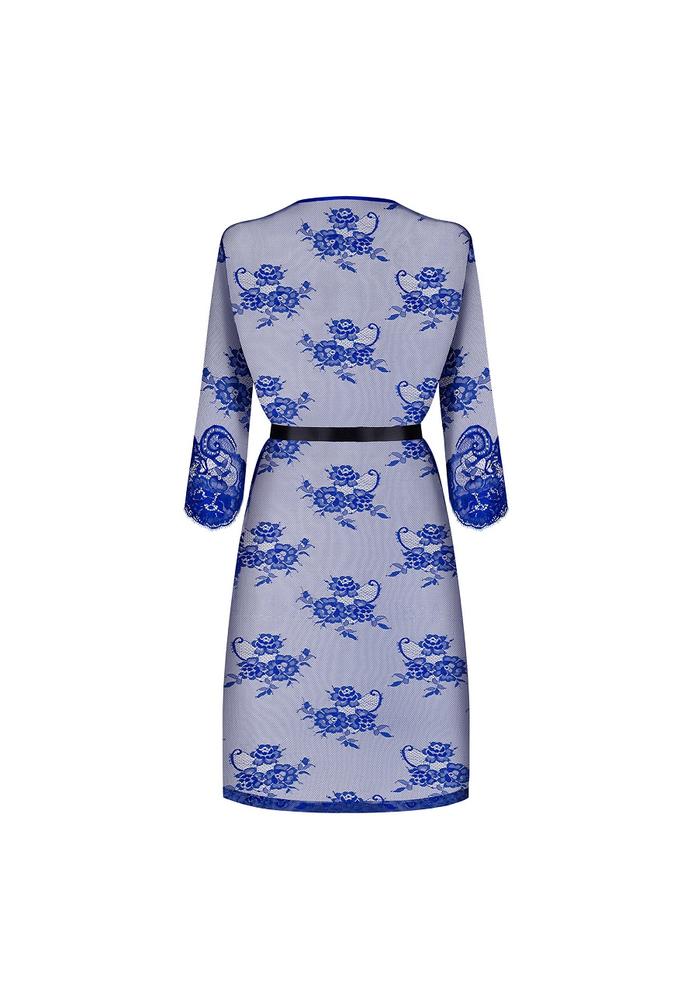 Kobiecy peniuar z koronkowymi zdobieniami oraz prześwitującym materiałem, który podkreśla sylwetkę. Satynowe wiązanie to perfekcyjne dopasowanie, a wykończenie koronką eyelash to detal pełen seksapilu.