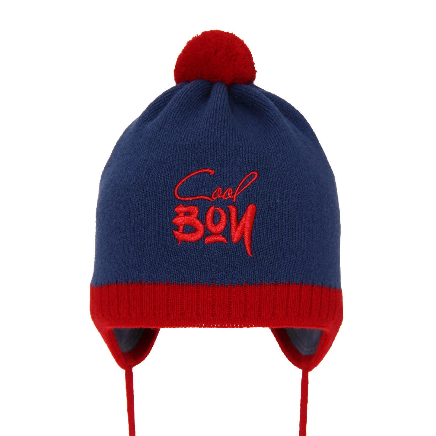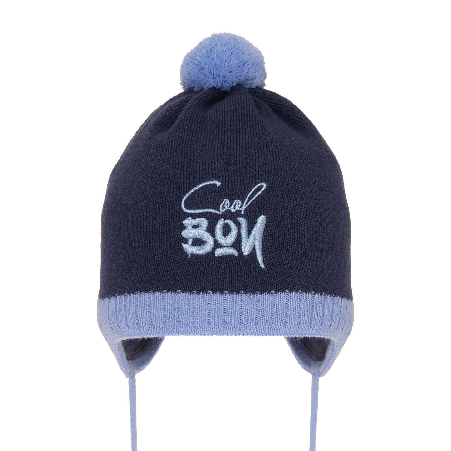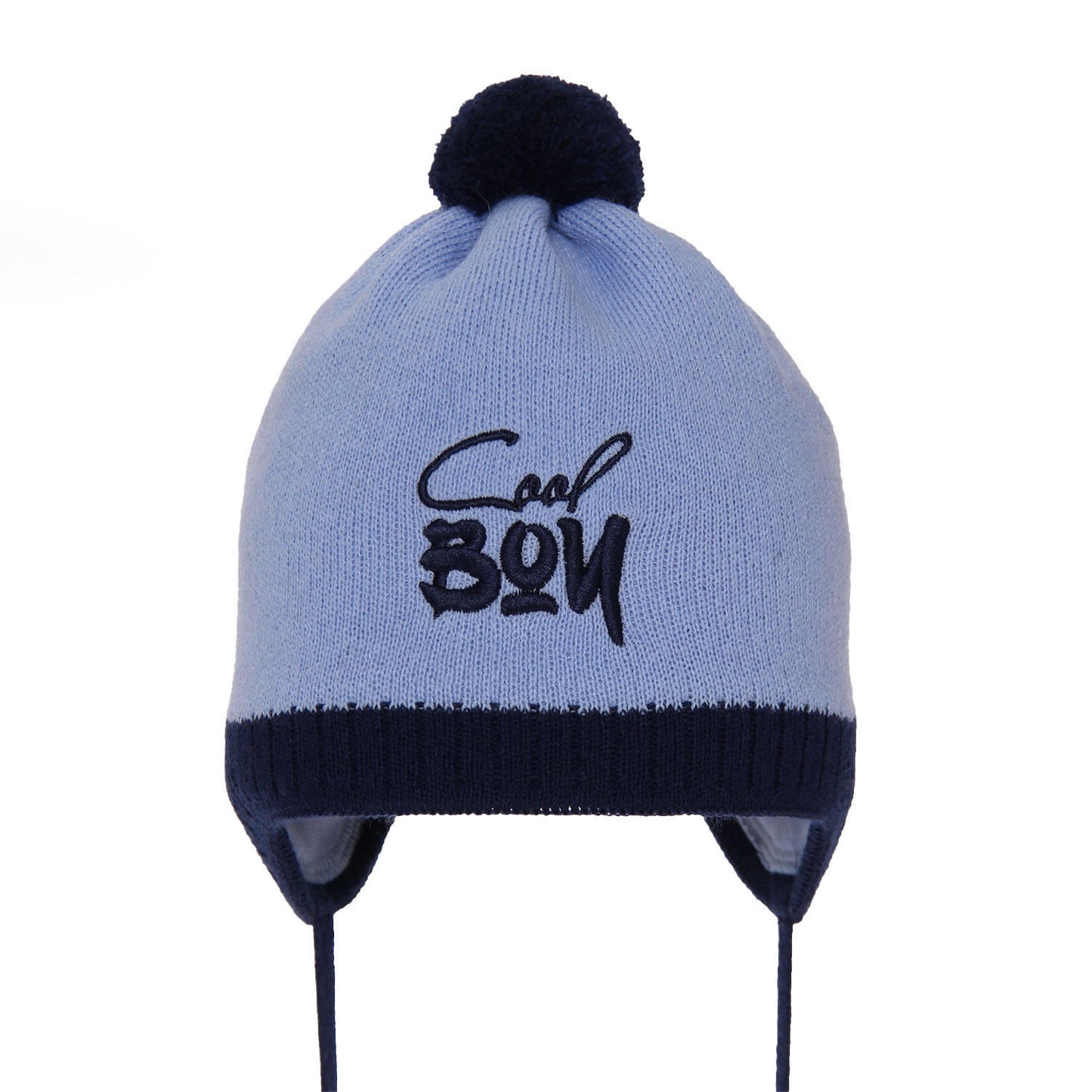 Czapka jesienna/ wiosenna dla chłopca wiązana Korni, ciekawy, haftowany napis „Cool boy”, fantastyczne połączenia kolorystyczne, delikatne, miękkie podszycie z bawełny, niewielki, akrylowy pomponik, troki, dzięki którym czapka idealnie leży na głowie.
