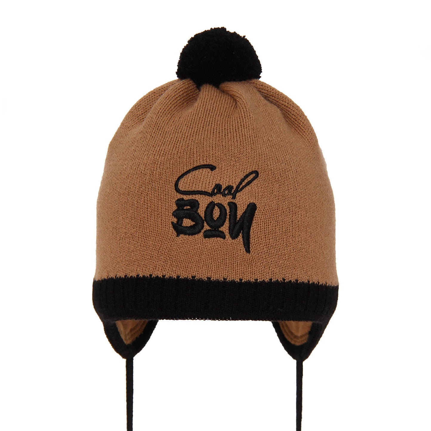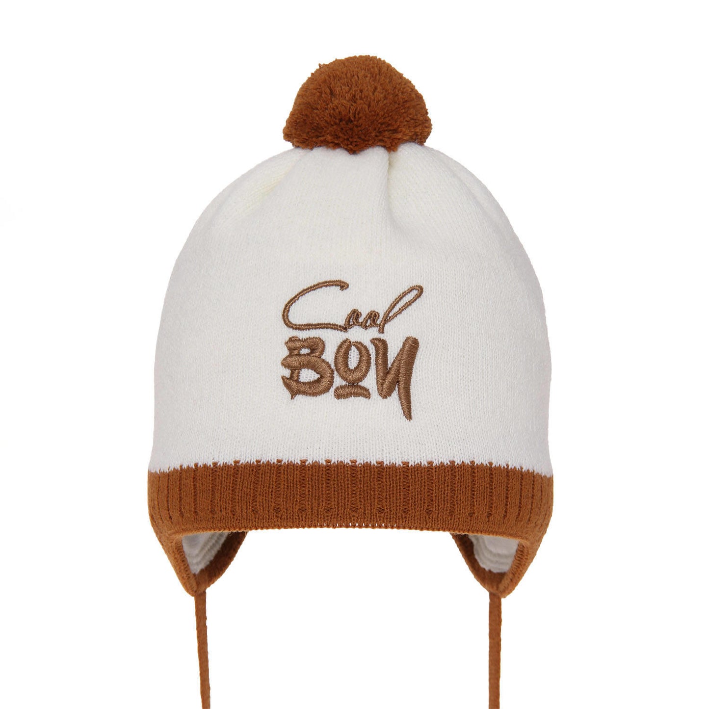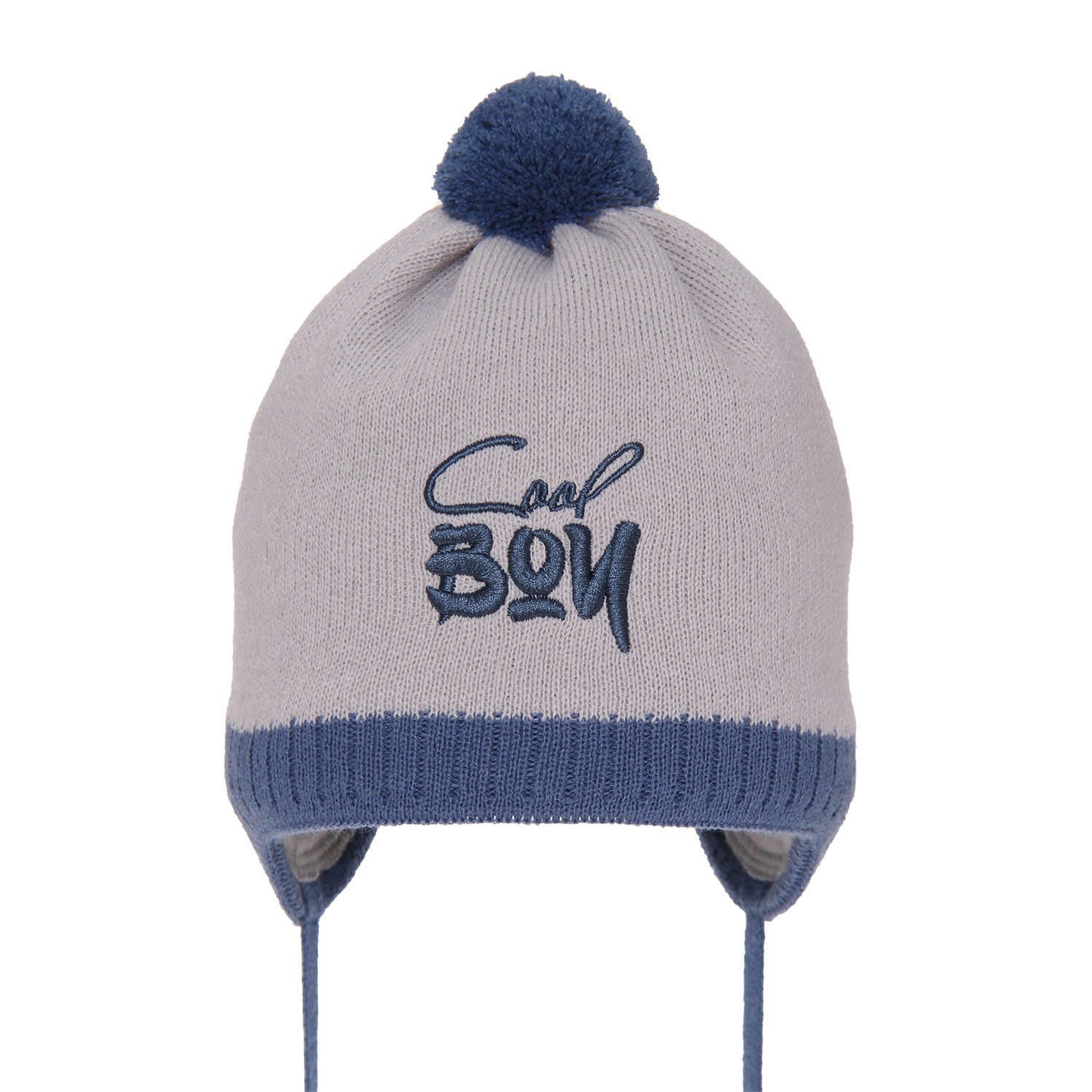 Czapka jesienna/ wiosenna dla chłopca wiązana Korni, ciekawy, haftowany napis „Cool boy”, fantastyczne połączenia kolorystyczne, delikatne, miękkie podszycie z bawełny, niewielki, akrylowy pomponik, troki, dzięki którym czapka idealnie leży na głowie.