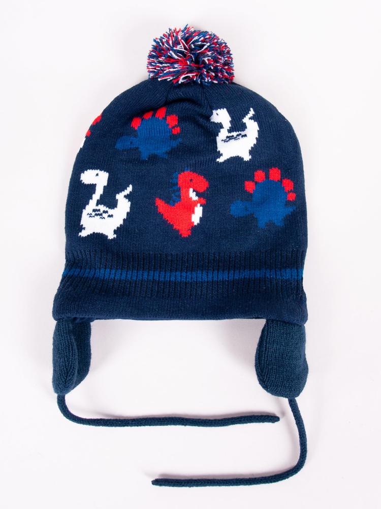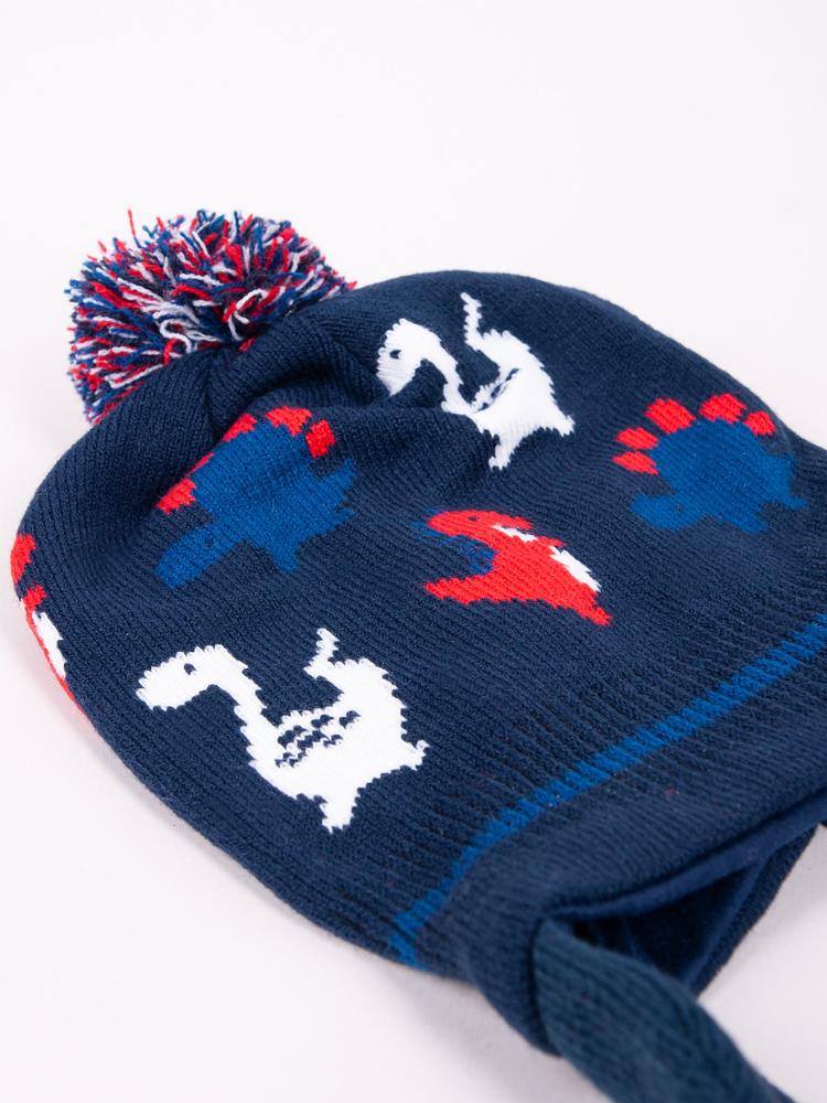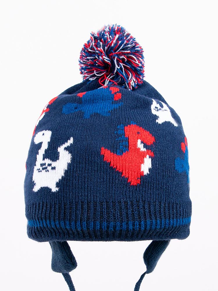 Zimowa czapka dla chłopca w kolorze granatowym, o regularnym, delikatnym splocie. Na całości ozdobiona białymi, czerwonymi i niebieskimi dinozaurami. Na górze znajduje się miły pompon z frędzli. Dwuwarstwowa – w środku posiada bawełnianą podszewkę.
