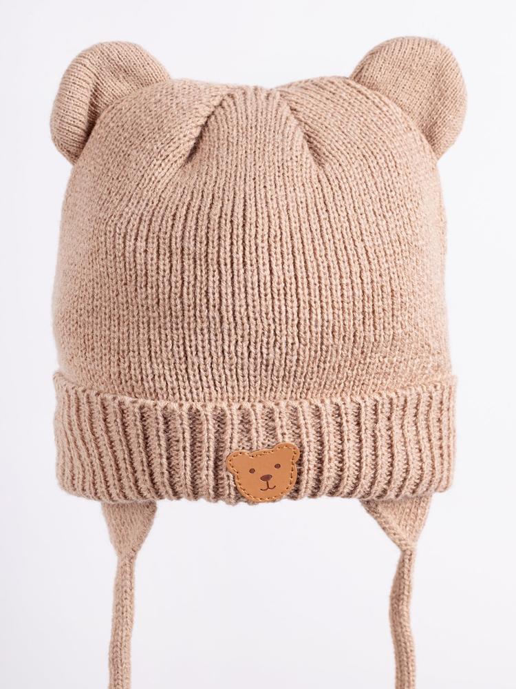 Zimowa czapka dla chłopca w kolorze brązowym. O regularnym, delikatnym splocie. Na górze znajdują się dwa uszka. Zakończona wywinięciem ze splotu ściągaczowego, na którym widnieje skórzana naszywka w kształcie misia. Dwuwarstwowa – w środku posiada bawełnianą podszewkę.
