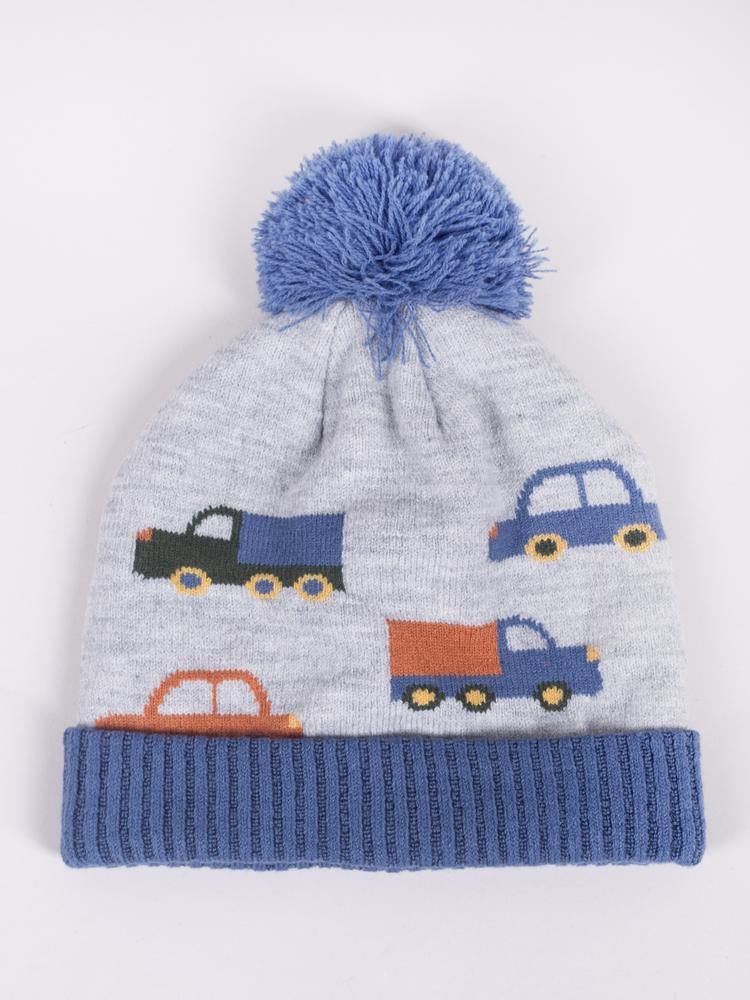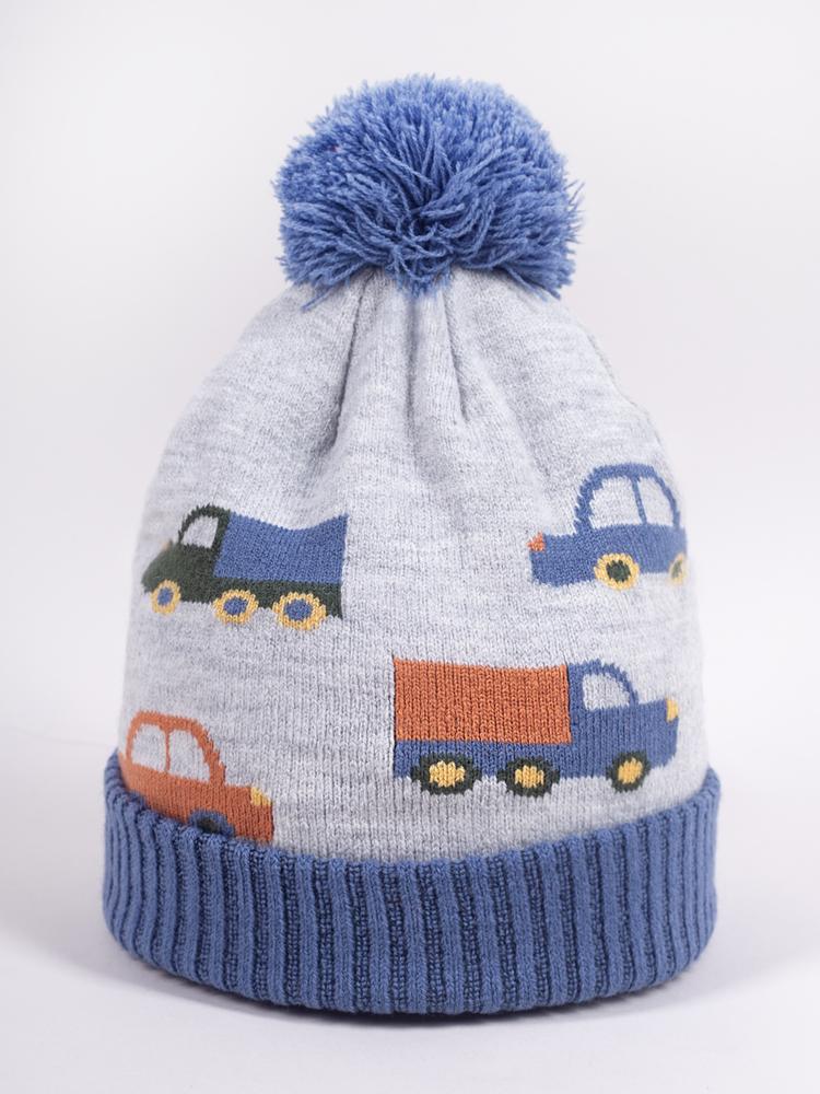 Zimowa czapka dla chłopca w kolorze szaro - niebieskim, o regularnym splocie. Ozdobiona uwielbianymi przez chłopców autkami. Na górze znajduje się milutki pompon z frędzli. Zakończona ściągaczowym wywinięciem. W środku posiada bawełnianą podszewkę.