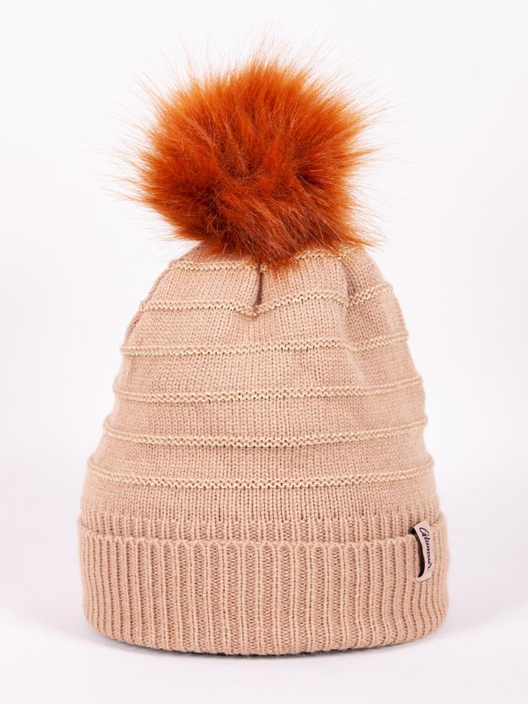 Zimowa czapka dla kobiety w kolorze brązowym. Przetkana nicią metaliczną. Na górze znajduje się milutki futrzany pompon. Zakończona wywinięciem, na którym widnieje naszywka z napisem: Glamour. Czapka jest jednowarstwowa, bez podszewki w środku.