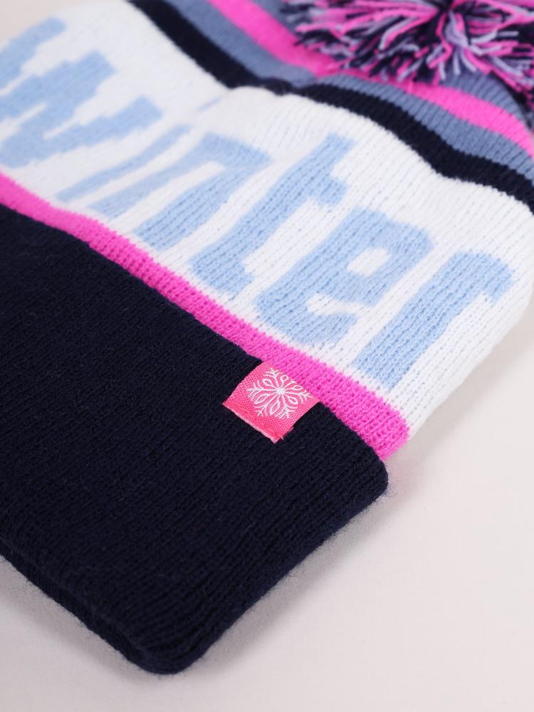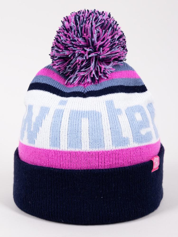 Zimowa czapka dla dziewczynki, różnokolorowa. O regularnym, delikatnym splocie. Na górze znajduje się milutki pompon z frędzli. Zakończona wywinięciem, na którym widnieje naszywka ze śnieżynką. Z przodu napis: WINTER. Czapka jest dwuwarstwowa.