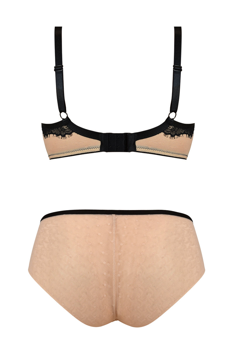 Figi pełne. Tył zabudowany, wykonany z siateczki w ozdobne kropki Przód z beżowej siatki w kropki połączonej z czarną koronką W talii czarna lamówka z beżową kokardką