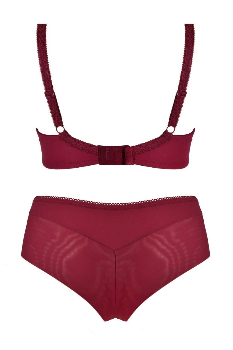 Zjawiskowe figi w bordowym kolorze doskonałe uzupełnienie biustonosza Vino. Górna linia z mikrofibry, środeczek z przezroczystym "okienkiem" z tiulu, ozdobiony kółeczkiem. W dolnej części tył i przód wykończone koronką. Koronka i dodatki to wysokiej jakość francuskie surowce.