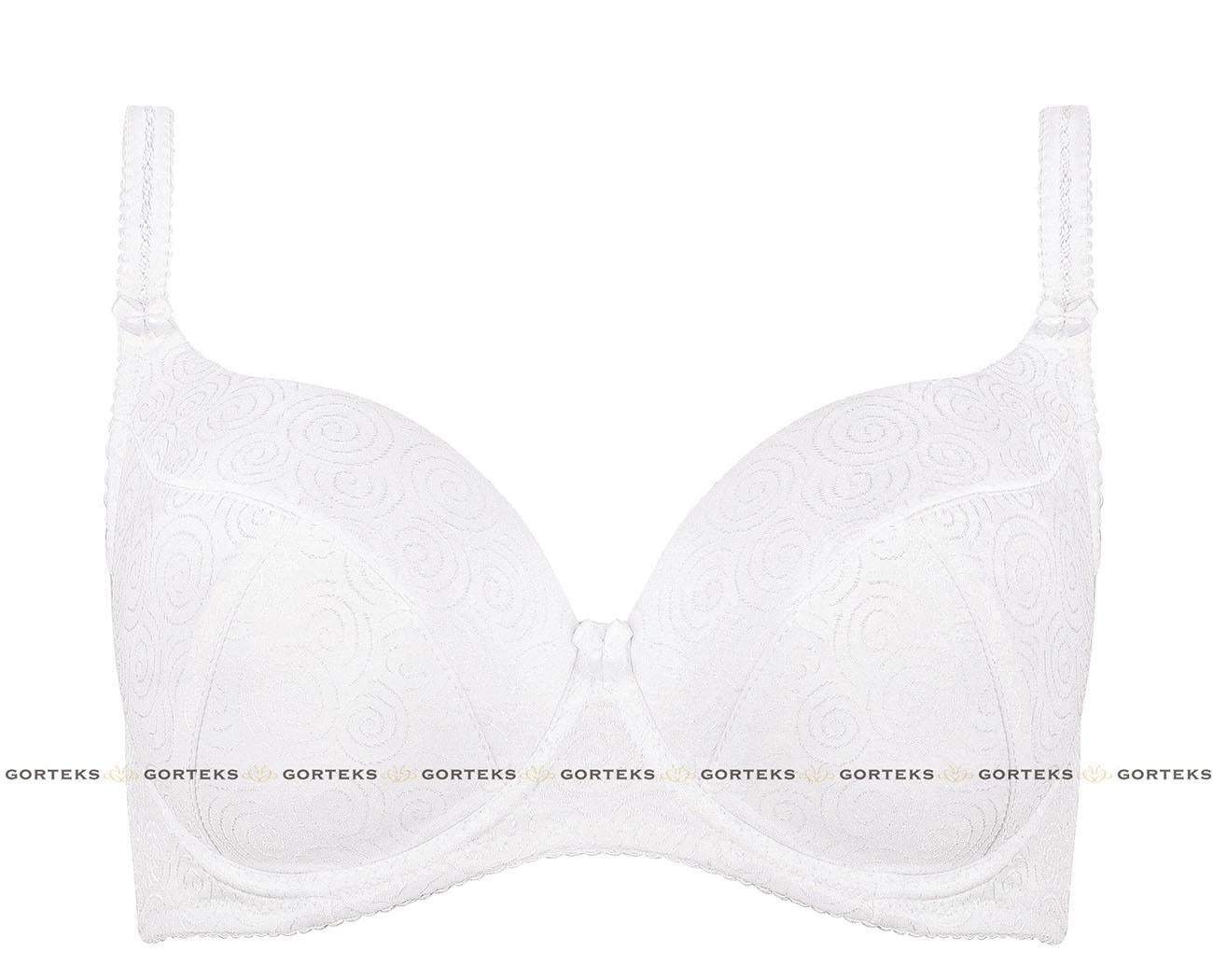 Klasyczny biustonosz usztywniany doskonale podtrzymuje biust. Wykonany z delikatnej dzianiny typu żakard ozdobionej subtelnym wzorem. Między miseczkami urokliwa kokardka.