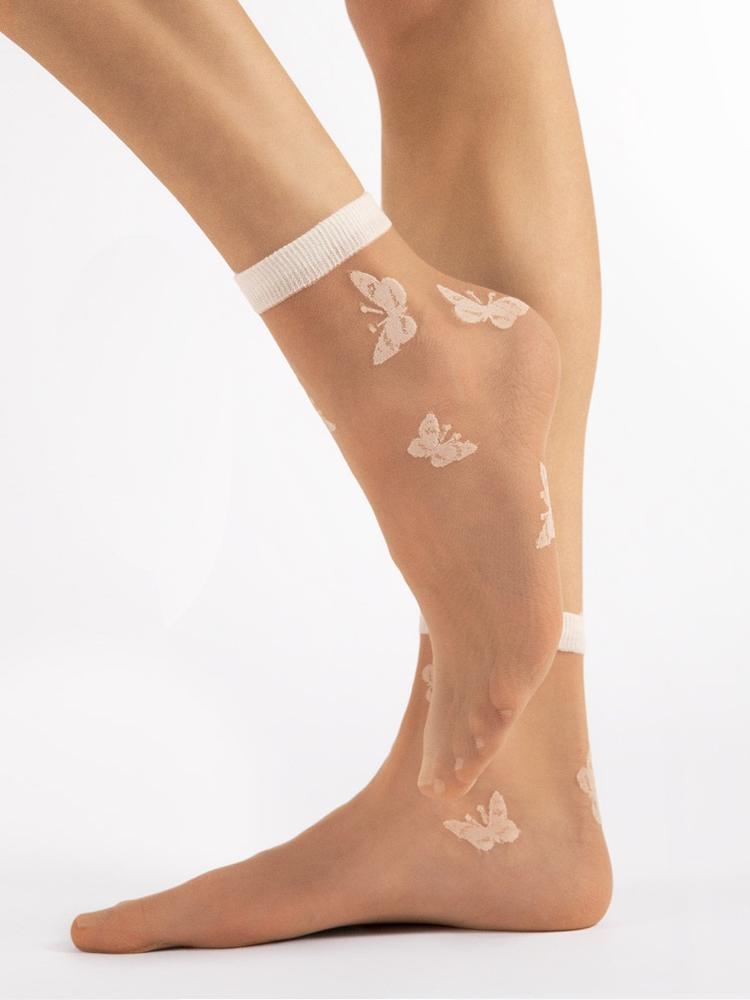 Cieniutkie i transparentne skarpetki we wzór motyli skoncentrowanych wokół prostego, gładkiego ściągacza, czyli tak aby eksponować je blisko kostki. Pasują do wszystkich wiosennych i letnich butów.