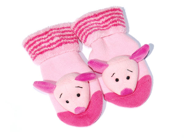 Bawełniane skarpeteczki z grzechotką ukrytą wewnątrz zwierzątka przyszytego nad paluszkami przeznaczone dla niemowlaków w wieku od 0 do 6 miesięcy.