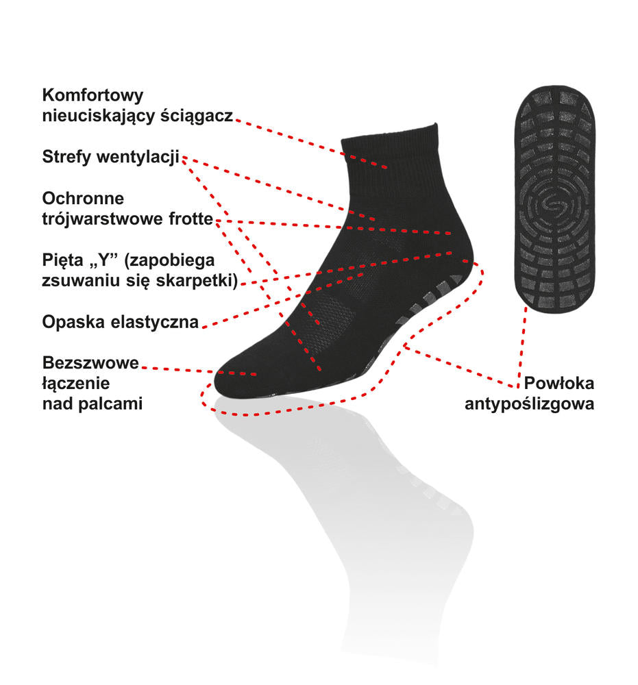 Skarpetki antypoślizgowe do ćwiczeń. Skarpetki przeznaczone do użytkowania bez obuwia, szczególnie użyteczne na salach do ćwiczeń, rehabilitacji i siłowniach. Silikonowe wykończenie na podeszwie (ABS) zapobiega poślizgom.