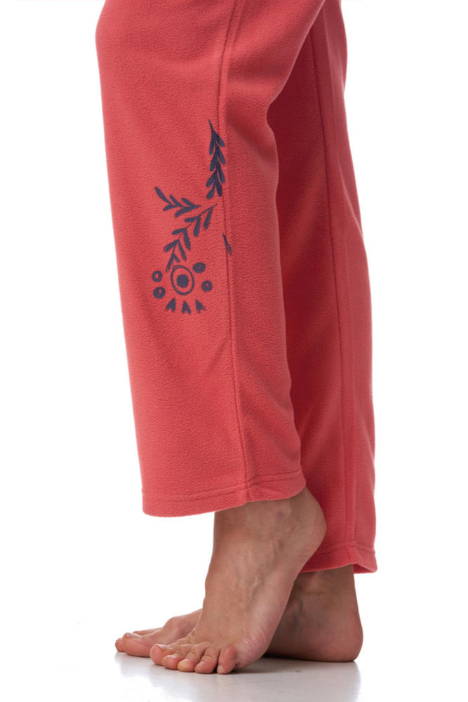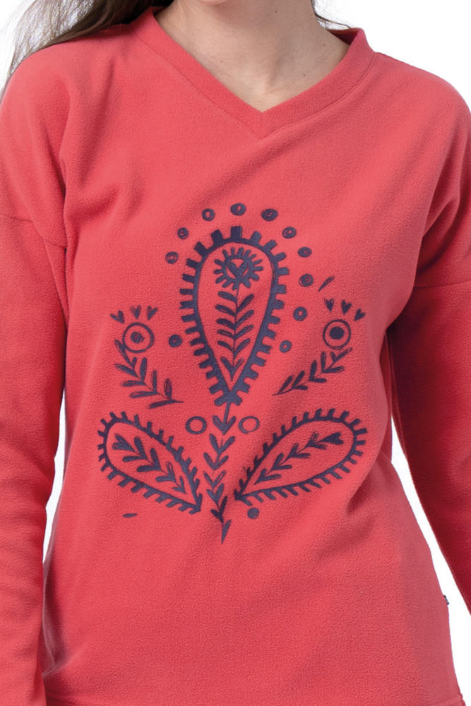 Ciepły komplet damski z miękkiego otulającego polaru. Luźna bluza o kobiecym kroju i obniżonej linii ramion oraz wygodne spodnie z szerokim i miękkim pasem.