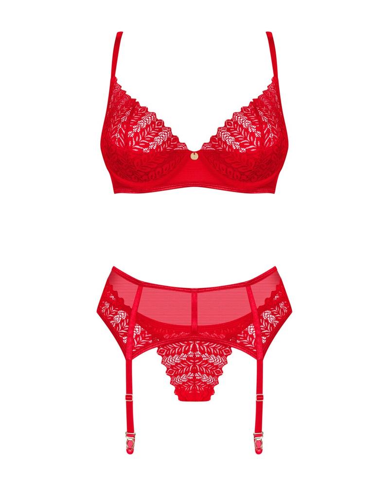 Powietrze zadrży, a atmosfera stanie się niezwykle gorąca, kiedy założysz uwodzicielski, trzyczęściowy zestaw Ingridia. Nie będziesz mogła odpędzić się od komplementów, gdy Twoją skórę okryje zmysłowa czerwień. Dzięki regulowanym ramiączkom oraz kilkustopniowym zapięciu gwarantuje doskonałe dopasowanie do figury. Miseczki dodatkowo wzbogacone w fiszbiny znakomicie eksponują biust. Każdy z elementów kompletu został zaprojektowany z dbałością o szczegóły, które zagwarantują kuszący wygląd oraz pomogą odkryć nowy poziom komfortu. Na komplet skłąda się elegancki biustonosz, pas do pończoch oraz seksowne stringi. Całość została zapakowana w estetyczne pudełko.